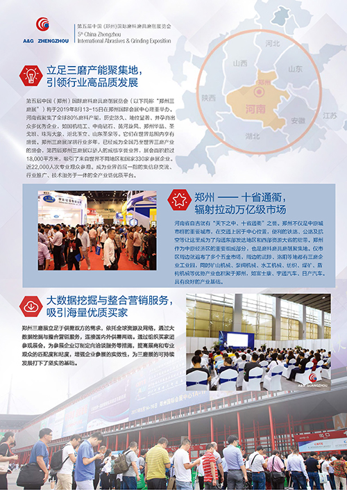 中國(guó)(鄭州)國(guó)際磨料磨具磨削展覽會(huì)(簡(jiǎn)稱:三磨展)是以磨料磨具、超硬材料及制品、涂附磨具為主體,涵蓋磨削全產(chǎn)業(yè)鏈最新技術(shù)和產(chǎn)品,提供磨削解決方案,國(guó)內(nèi)唯一、全球知名的國(guó)際磨削技術(shù)專業(yè)展會(huì)。