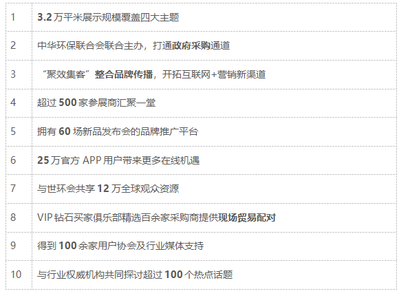 上海國(guó)際固•廢氣展作為全球范圍內(nèi)超大規(guī)模的世界環(huán)保博覽會(huì)平臺(tái)世環(huán)會(huì)系列展之一,與上海國(guó)際水展、上海國(guó)際泵管閥展、上海國(guó)際智慧環(huán)保及環(huán)境監(jiān)測(cè)展、上海國(guó)際空氣新風(fēng)展、上海國(guó)際建筑水展以及上海國(guó)際生態(tài)舒適家居展共同構(gòu)成了環(huán)保全產(chǎn)業(yè)鏈格局以及強(qiáng)大的規(guī)模效應(yīng),共享12萬(wàn)觀眾資源,為參展效果保駕護(hù)航!