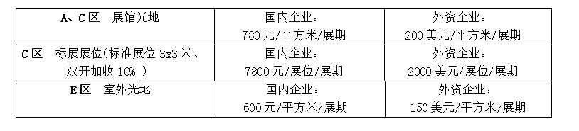 展位收費(fèi)標(biāo)準(zhǔn):(標(biāo)準(zhǔn)展位含洽談桌一張,椅子兩把,楣板一條,三面展板,220V/5A電源。光地不帶任何展架及設(shè)施,參展商可委托組織單位搭建。)