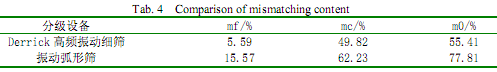 由表4可以看出,Derrick高頻振動細篩的總錯配物含量為55.41%,振動弧形篩的總錯配物含量為77.81%,比Derrick高頻振動細篩的總錯配物含量高出22.40個百分點,由此看出采用Derrick高頻振動細篩處理細粒物料時,粗細顆粒物料的錯配低。