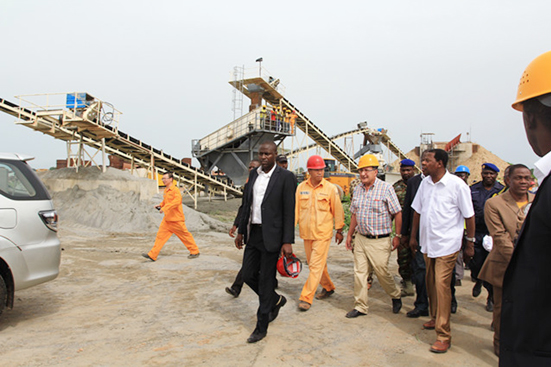近日,貝寧總統博尼•亞伊到上海山美重型礦山機械有限公司承建的砂石骨料生產線視察訪問,亞伊總統同時視察了貝寧最大的水泥生產線NOCIBE水泥廠。當地政府要員、項目業主代表以及中材集團(Sinoma)貝寧項目經理等參與迎接。