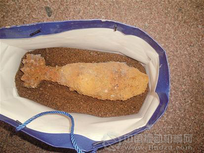 75歲的蔡師傅,在黃陂區蔡店經營著一家磚廠。昨日上午,他像往常一樣展開工作。工人篩砂時,砂礫掩映中出現一大塊固狀物體(如圖)。起初,大家還以為是銹蝕的軸承,還有人準備用錘子敲開一探究竟。一位圍觀老人發現,這個物體一端有銅芯,極可能是炮彈,當即制止敲擊行為。