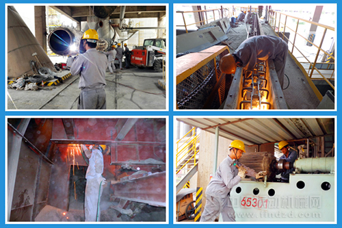 此次檢修時間短、任務(wù)重,加之天氣炎熱,全體參檢人員不怕苦累,克服惡劣環(huán)境因素,連續(xù)奮戰(zhàn)在檢修現(xiàn)場,順利完成了:回轉(zhuǎn)窯二檔輪帶浮動板調(diào)整、6511回轉(zhuǎn)窯更換耐火磚27余米、原料磨磨盤襯板堆焊、原料磨刮板更換、窯頭窯尾電收塵檢修等重要項目。