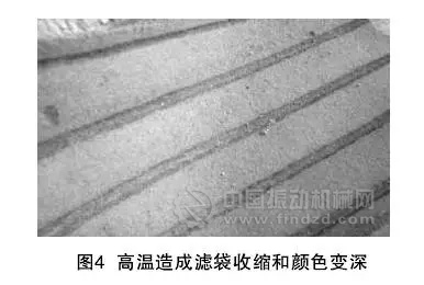 由于多數(shù)濾袋是在高溫下工作的,因此,高溫會造成濾袋纖維玻璃態(tài)化,使濾袋纖維發(fā)生降解變化,造成纖維大分子鏈斷裂。從外表上看,高溫造成濾袋收縮變形、變硬,濾袋緊緊箍在骨架上,甚至無法抽出濾袋中的骨架,從而在濾袋內(nèi)表面形成深深的痕跡(如圖4所示),并使得濾袋纖維玻璃化變得極其脆弱,強(qiáng)度降低。圖5為廣州某垃圾焚燒廠除塵器的濾袋,濾袋材質(zhì)為PPS纖維,高溫使得PPS纖維變得極其脆弱,強(qiáng)度降低,輕輕一拉,就會撕開一條長長的口子。