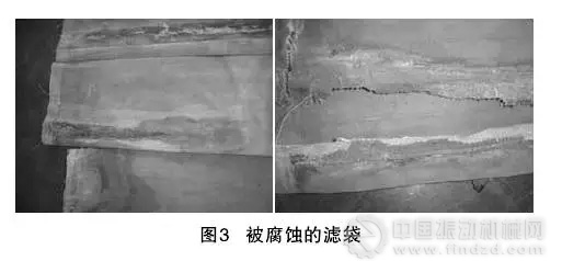 濾袋被腐蝕損壞的痕跡多為放射狀,并在濾袋表面形成大面積變色,造成濾袋變硬、變脆和出現(xiàn)少量不規(guī)則的洞,用肉眼可分辨出來。圖3為河南某氧化鎂廠氯化工段被腐蝕的濾袋,由于該廠煙氣中的HCl含量非常高,PTFE濾袋平均使用壽命不到3個(gè)月就被腐蝕得千瘡百孔無法繼續(xù)使用。所以,如果在此條件下進(jìn)行脈沖清袋,將會加速濾袋的損壞。