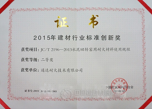 會上公布了2015年度“建筑行業(yè)標(biāo)準(zhǔn)化創(chuàng)新獎”獲獎名單,共有27個項(xiàng)目獲得2015年度“建材行業(yè)標(biāo)準(zhǔn)化創(chuàng)新獎”,其中金隅通達(dá)耐火技術(shù)股份有限公司作為主要編寫單位完成的JC/T2196-2013《水泥回轉(zhuǎn)窯用耐火材料使用規(guī)程》榮獲“全國建材行業(yè)標(biāo)準(zhǔn)創(chuàng)新項(xiàng)目”二等獎。