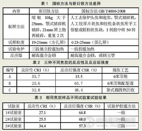 目前國標試驗方法與新日鐵試驗方法的差異歸納見表1。焦炭粒度差異已經(jīng)較前兩版縮小,但是,在I轉鼓中轉50轉,使得焦炭試樣的表面光滑,一方面降低焦炭反應性,另一方面提高了反應后強度。新日鐵方法采用3段獨立控制加熱,試驗樣溫度均勻;國標采用一段控溫加熱,試驗樣的溫度均勻略差。而且焦炭與CO2的反應是吸熱反應,用鋼玉管作為反應器時供熱速度低于耐高溫合金鋼,也會降低焦炭反應性,且反應性越高吸熱量越大,差異越大。綜上所述,國標法的試驗結果與新日鐵方法的試驗結果有較大的差異。因此,國標法試驗結果不應該再用新日鐵的CRI和CSR的縮寫表達反應性和反應后強度,因為全世界都已經(jīng)公認,CRI和CSR就是采用新日鐵的試驗方法所得數(shù)據(jù)。