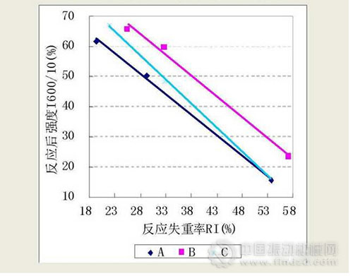 反應時間的影響。3種不同煉焦工藝和不同配煤所生產(chǎn)的3種焦炭,傳統(tǒng)試驗方法的反應性及反應后強度見表2。反應性從25.6%到53.7%,差異超過1倍;反應后強度從15.5%到65.7%,差異超過了3倍。通過改變反應時間,使這3種焦炭的反應失重率都在20~60變化,反應后強度與失重率之間的關系見圖1。3種不同焦炭反應失重率與反應后強度之間都呈現(xiàn)很好的負線性關系,但不同工藝相關線的斜率不同,A和B兩種焦炭反應性和反應后強度差異最大,但相關線近似平行線;C焦炭是臥式搗固熱回收焦爐生產(chǎn),配煤中配有一定比例的無煙煤,焦炭氣孔率較低,炭相結構的各向異性程度高,反應模式趨向于均相反應,反應后強度與反應失重率相關線斜率大于傳統(tǒng)6米頂裝焦爐的焦炭,大高爐不能大量使用這種焦炭的原因就在于此。