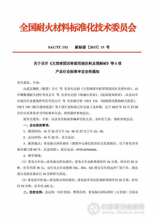 由武漢鋼鐵(集團)公司等負責制定的《大型球團回轉窯用澆注料及預制磚》,由中鋼集團耐火材料有限公司等負責制定的《熔融石英磚》、《抗滲透高鋁磚》,以及由中冶武漢冶金建筑研究院有限公司等負責修訂的YB/T114《硅酸鋁質隔熱耐火泥漿》、YB/T150《耐火緩沖泥漿》等5項行業標準已經完成了送審稿。定于2015年10月27-28日在山東青島市召開標準審定會。