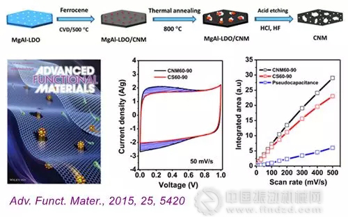 最近陜西師范大學材料科學與工程學院雷志斌教授課題組與大連理工大學邱介山教授課題組合作,建立了一種模板輔助化學氣相沉積制備二維超薄碳納米篩的新方法。該方法利用二茂鐵易于升華和易于熱解的特性,以具有六方結構的MgAl-LDO為模板,在其表面同時沉積超薄碳層和~2 nm的超細Fe粒子,Fe粒子迅速轉化為Fe2O3,并在隨后的800 oC熱解過程中,開始腐蝕周圍的碳層,形成具有中空結構的“餅狀”超薄碳納米篩。納米篩富含由微孔、1-6 nm及10-50 nm的中孔構成的多級孔道,通過改變沉積時間及熱解條件,可對孔的密度、幾何形狀進行有效調控。研究表明,二維面內納米孔有助于促進納米孔邊緣含氧官能團參與贗電容反應,且有利于電解質在垂直于二維平面內的傳輸,顯著提高了電極材料的電容性能。