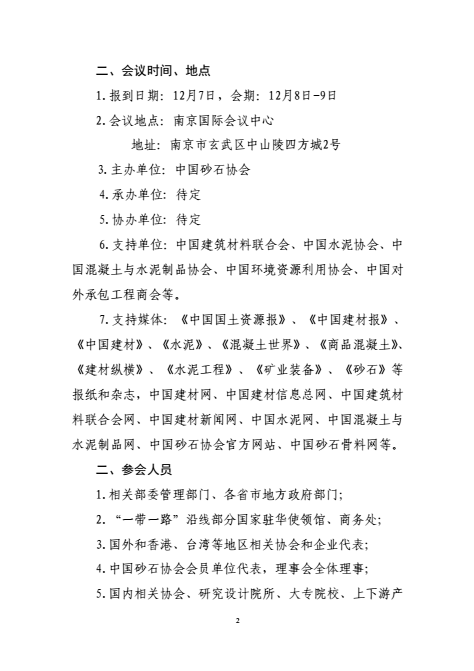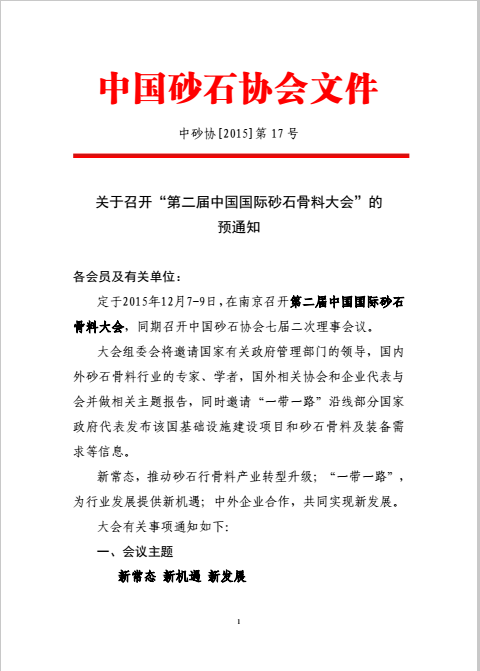 定于2015年12月7-9日,在南京召開第二屆中國國際砂石骨料大會,同期召開中國砂石協會七屆二次理事會議。
