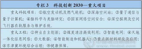 綱要確定了一批科技創新2030重大科技項目和工程。其中,重大科技項目有6個,即航空發動機及燃氣輪機、深海空間站、量子通信與量子計算機、腦科學與類腦研究、國家網絡空間安全、深空探測及空間飛行器在軌服務與維護系統;9大工程則包括,種業自主創新、煤炭清潔高效利用、智能電網、天地一體化信息網絡;大數據;智能制造與機器人、重點新材料研發及應用、京津冀環境綜合治理、健康保障。