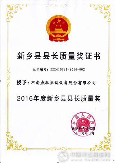 近日,新鄉縣政府下發文件授予河南威猛振動設備股份有限公司“2016年度新鄉縣縣長質量獎”榮譽稱號,并通報表彰。河南威猛振動設備股份有限公司作為縣振動利用設備行業唯一獲獎企業,備受關注。