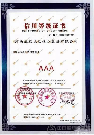2016年3月14日,河南威猛振動設備股份有限公司再度成功獲得企業信用評價“AAA級信用等級”榮譽稱號。這是國家權威信用評定的最高等級!