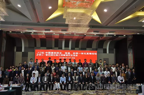 2016 年4月15日,“2016中國建筑防水、保溫、砂漿一體化高端論壇暨機械化施工觀摩演示交流會”在濟南軍悅世源酒店盛大召開!本次大會特邀中國硅酸鹽學會 房建材料分會防水保溫材料專業委員會沈春林主任、中國散裝水泥推廣發展協會丁建一秘書長、山東省散裝水泥辦公室主任于東威、山東省建筑產業現代發展聯盟秘 書長周詠霞、中國國家建材研究總院技術高工/中國建材檢測認證中心總工李運北、壽光市防水行業協會副會長/山東宏恒達防水材料工程有限公司董事長孟憲龍、 濟南市防水防腐保溫行業協會史素潔秘書長、濟南市散裝水泥辦公室主任李法學等相關領導、行業同仁及媒體近300人參加了本次盛會。