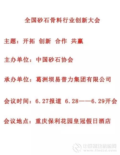 中國砂石協會于2016年6月27-29日在重慶召開《全國砂石骨料行業創新大會》。