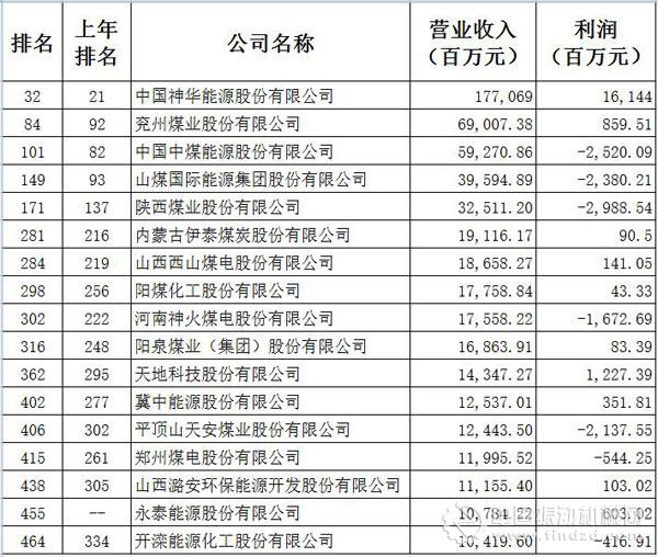 煤炭行業(yè)有17家公司上榜。除兗州煤業(yè)外,其余上榜的煤炭企業(yè)排名較去年均有所下滑,其中7家公司虧損。其中,中國神華繼續(xù)排名第一,位次較上年下降11位,排名第32;兗州煤業(yè)排名第二,位次較上年上升8位,排名第84。永泰能源股份有限公司首次入選。