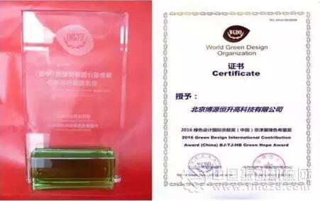 2016年3月29日至30日,在2016世界綠色設(shè)計(jì)論壇京津冀綠色發(fā)展大會(huì)上,北京大學(xué)博士生導(dǎo)師、北京博源恒升高科技有限公司技術(shù)總監(jiān)魏雄輝博士發(fā)明的科研成果“DDS煙道氣除塵脫硫脫硝技術(shù)”獲得綠色設(shè)計(jì)國(guó)際貢獻(xiàn)獎(jiǎng)(中國(guó))京津冀綠色希望獎(jiǎng)。