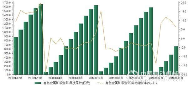 2016年6月有色金屬礦采選業(yè)固定資產(chǎn)投資額年度累計669.00億元,同比增長率6.30%。