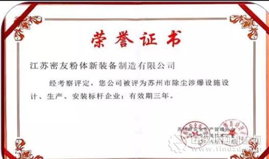 近日,江蘇密友粉體新裝備制造有限公司榮獲了蘇州市除塵涉爆設施設計、生產、安裝標桿企業的榮譽稱號并收到了蘇州市安全生產管理協會頒發的榮譽證書及牌匾。