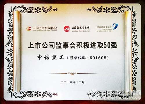 12月15日,在中國上市公司協會、上海證券交易所、深圳證券交易所共同主辦的“上市公司監事會最佳實踐評選活動”頒獎典禮上,中信重工公司獲評“上市公司監事會積極進取50強”。