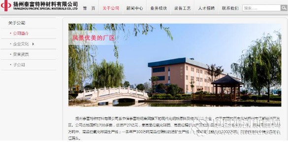 公開資料顯示,揚州泰富特種材料有限公司系中信泰富特鋼集團旗下的現代化鋼鐵物流綜合企業,位于美麗的歷史名城揚州市江都經濟開發區。公司占地面積1700多畝,總資產27億元,集高品位氧化球團、高品位精礦生產及物流樞紐中心三大板塊為一體。擁有兩條年產300萬噸中、高品位氧化球團生產線;一條年產300萬噸高品位精粉的選礦生產線;一座年吞吐能力達2000萬噸、可提供物料中轉業務的長江碼頭。