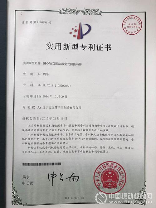 遼寧志遠篩子王公司2015年獲得偏心軸雙振動器寬式圓振動篩獲實用新型專利。規格有5層,4層,3層3073,3673,還有,5層,4層,3層2680,2480,深受選礦行業,高鐵,高速公路行業喜歡和好評。