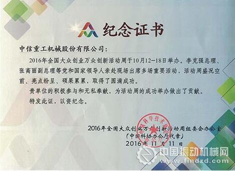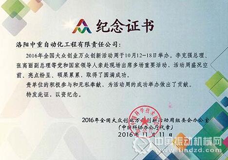 近日,中國科學技術協會對2016年全國大眾創業萬眾創新活動周進行了總結表彰,鑒于公司為活動周成功舉辦做出的貢獻,2016年全國雙創周組委會向中信重工、中信重工自動化公司分別頒發了紀念證書。