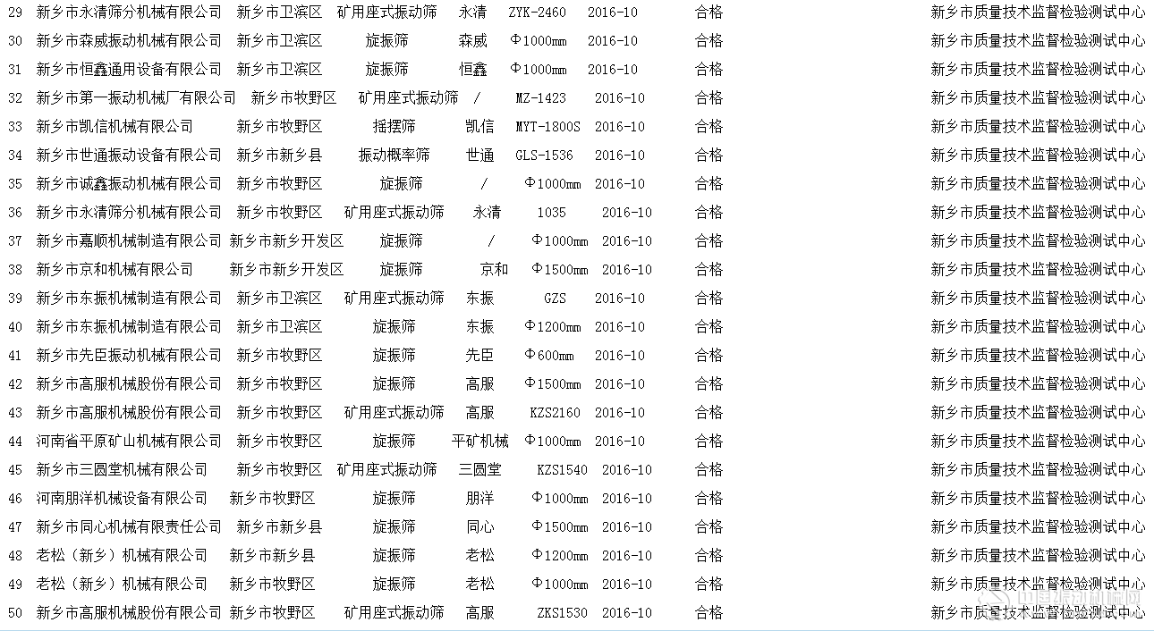 據河南省質量技術監督局官網4月26日消息,該局2017年第1季度對發制品等20種產品進行了產品質量監督抽查。其中,抽查了新鄉市轄區41家企業生產的50批次振動篩產品。經抽樣檢驗,50批次產品全部符合標準要求。 本次抽查依據JB/T3687.2-2012《礦用座式振動篩 第2部分:技術條件》、JB/T5774-2007 《旋振篩》及《2017年第1批振動篩產品質量河南省監督抽查實施方案》,對振動篩產品的結構要求、篩面與篩框的固定、振動篩運轉、振動篩運轉時軸承工作溫升、最高溫度、篩箱橫向振幅、同一對稱點彈簧高度差、板安裝質量、噪聲、防護裝等項目進行了檢驗。