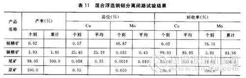 經粗磨拋尾,粗精礦再磨,兩次精選,銅鉬礦混合精礦中銅品位25.53%,回收率89.67%;鉬品位0.55%,回收率92.49%,大部分銅、鉬得到回收。