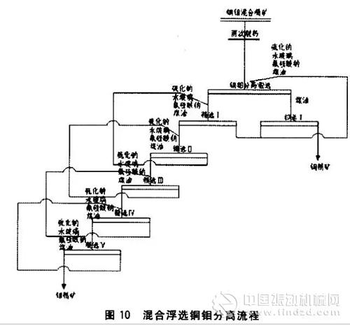 粗磨拋尾混合浮選工藝即粗磨后粗掃選丟尾、粗精礦再磨、浮選柱精選產出銅鉬混合精礦、銅鉬混合精礦脫藥后再磨、銅鉬分選產出銅精礦和鉬精礦