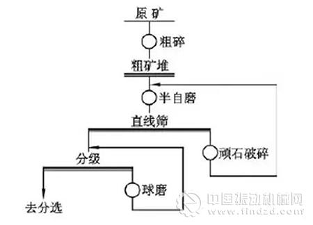 SABC 流程是把半自磨機中排出來的全部“難磨粒子”經細碎機破碎后,再返回半自磨機。自磨產品經篩分分級,篩下產物即分級后的沉砂送第二段球磨;篩上產品經過皮帶運輸機運至頑石倉,再經皮帶給礦機給到頑石破碎機,破碎后的產品返回半自磨機。