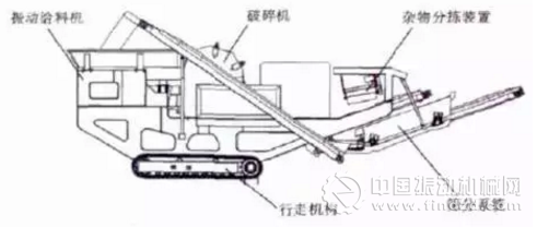 由破碎機、篩分系統、雜物分揀裝置、傳送機構和振動給料機、自行走功能一同構成了移動式破碎站。并且,將行動機構配置進去,可以說這個生產線是移動的,圖1 為基本的構造圖。