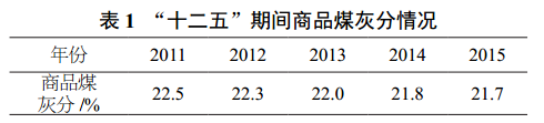 (1)商品煤灰分逐步降低。煤炭產量由2011年的35.2億t增長到2015年的37.5億t,增長了2.3億t,其中2013年最高產量達到38.7億t,而入選量增加了6.2億t;在此期間商品煤灰分逐漸降低到22%以下(見表1)。