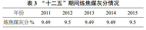 (3)煉焦商品煤質量逐步提高并趨于平穩。盡管原煤質量大幅度下降,但煤炭企業通過加大煉焦煤洗選加工投入,改造工藝,深入挖潛,在煉焦煤產量增長的同時,保證了煉焦商品煤的質量,我國煉焦煤灰分由2005年的9.79%逐步下降到2009年的9.51%,并趨于平穩,2009—2016年灰分基本在9.5%左右(見表3)。需要指出,為保證優質的煉焦煤資源不被浪費,煉焦煤灰分并不是越低越好,目前的灰分條件已完全可以滿足冶金行業使用。