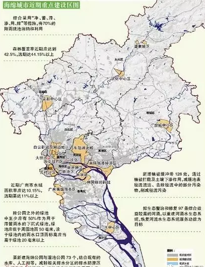 近期廣州市各區海綿城市的建設重點區域為:從化中心區和溫泉部分區域;南沙蕉門河中心區;增城中心區;天河車陂涌流域;海珠琶洲和廣紙地區;番禺大學城、南站商務區部分區域和國際創新城;白云新城及周邊地區;花都中心區;荔灣大坦沙、芳村地區;越秀流花湖片區、二沙島地區;黃埔臨港經濟區。