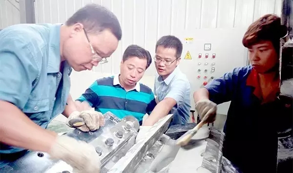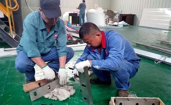 此次更換動刀片為7組,共14片。檢修小組首先是用毛刷清理破碎機外圍的粉料,將破碎機打開,再將刀片逐一拆下。難點在于更換新動刀片的定刀和動刀的尺度。由于生產工藝需求,定刀和動刀之間刀刃間隙必須在0.3-0.4毫米之間,且每把刀與刀之間都要保持尺寸一致,這就要求檢修人員必須做到認真細致。經過近2小時的努力,14片刀片更換完畢,經過投料試機,破碎出來的原料顆粒比以往明顯小了一圈,更加均勻,為確保皕盛下半年穩定生產打下堅實的基礎。