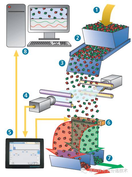 摩根森色選機是通過高速相機捕捉下落過程中的石英石的顏色差異, 進(jìn)行圖像處理。然后計算機形成指令給高壓氣體噴嘴,噴嘴噴射出高壓氣體將異色的石英石在下落過程中噴出,實現(xiàn)與白色石英石的分離。