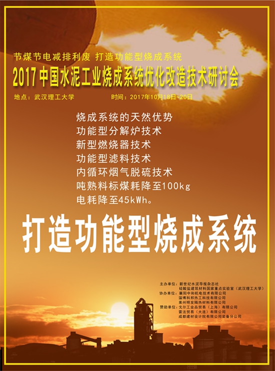當前,水泥產能嚴重過剩,水泥企業生產經營中更加看重生產線的低成本運行和環保功能,以期提高企業的市場競爭力。基于此,新世紀水泥導報雜志社與硅酸鹽建筑材料國家重點實驗室(武漢理工大學)決定在武漢聯合主辦以“節煤節電減排利廢打造功能型燒成系統”為主題的“2017中國水泥工業燒成系統優化改造技術研討會”,會期擬定于2017年10月18日-20日。