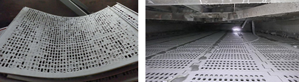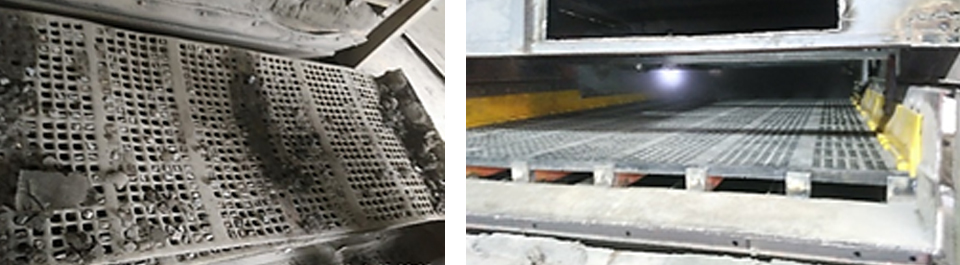 下層篩網(wǎng)改造前后對比:左圖聚氨酯篩網(wǎng)堵礦嚴(yán)重,右圖美卓T40橡膠篩板使用11個月后幾乎沒有堵礦。