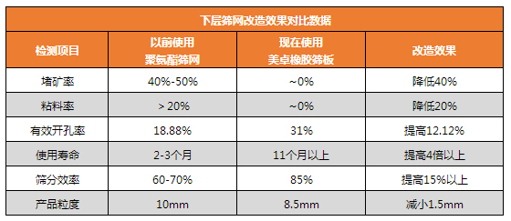 在這種情況下,改造的下層篩網(wǎng)需要優(yōu)先解決堵礦和粘料問題,提高篩分效率。其次,要減小篩下物產(chǎn)品粒度,降低磨機(jī)給礦粒度。同時,還要提高篩板的使用壽命,從而達(dá)到降低生產(chǎn)成本的根本目的。