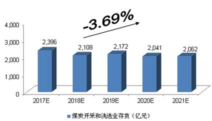 綜合以上因素,我們預計,2017年我國煤炭開采和洗選業存貨將達到2,396億元,未來五年(2017-2021)年均復合增長率約為-3.69%,2021年存貨將達到2,062億元。