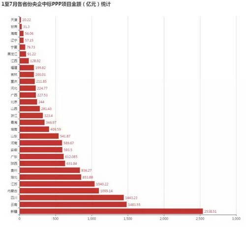 在新疆地區(qū)1-7月份,中國交建、中國建筑兩大巨頭分別以919億元、818億元占據(jù)有利市場,而中國交建則拿下708億新疆地區(qū)最大的PPP項(xiàng)目。