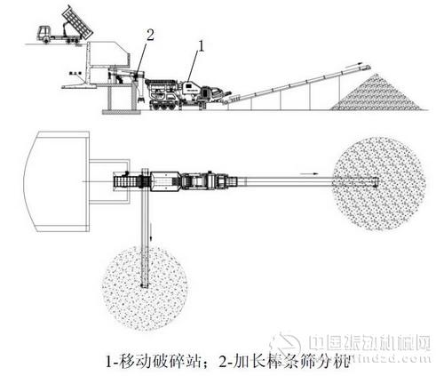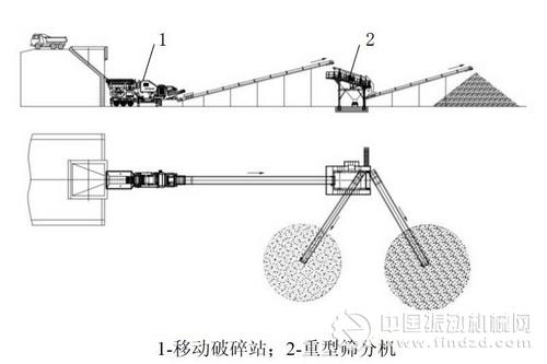 采用這種方案優點在于安裝布置方便,并可降低移動破碎機的負荷。但是棒條振動給料機主要功能是給料,篩分是次要功能,篩分效果較差,還需要再經固定破篩分后才能將含泥的細骨料完全篩出,增加了轉運成本和固定破碎系統的功耗,該方案不宜采用。