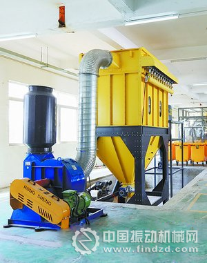 在磁選機(jī)的一側(cè)還有一臺(tái)設(shè)備在不停運(yùn)轉(zhuǎn)。原來這是廠區(qū)的除塵設(shè)備(圖5)。破碎機(jī)和磁選機(jī)都被巨大的罩子整個(gè)罩住,生產(chǎn)過程中形成的粉塵通過管道被除塵設(shè)備吸走,所以在廠區(qū)內(nèi)完全看不到煙塵彌漫的情形。