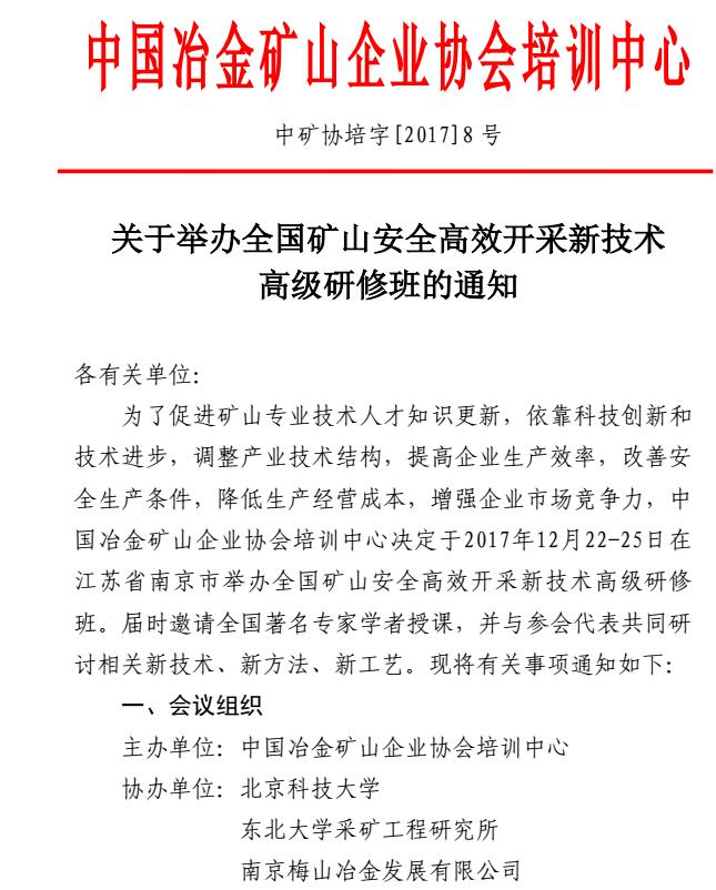 關于舉辦全國礦山安全高效開采新技術高級研修班通知