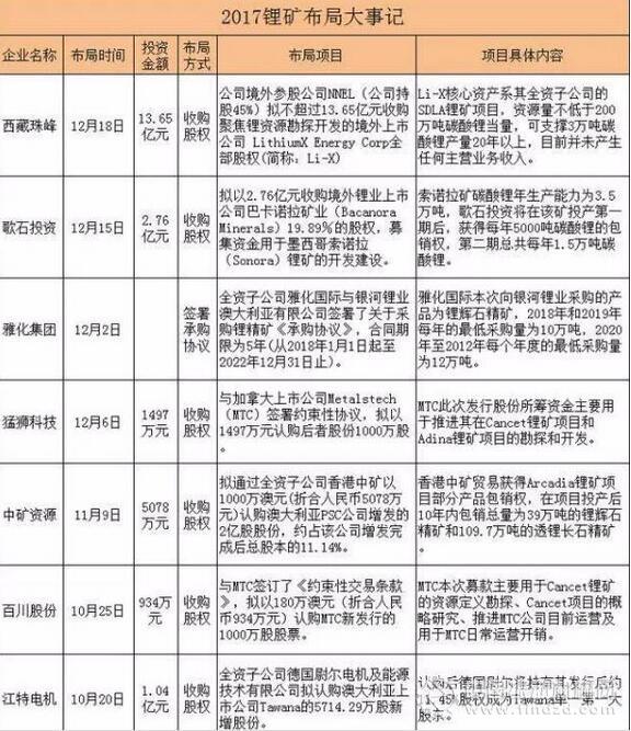 據(jù)不完全統(tǒng)計(jì),2017年國(guó)內(nèi)多方勢(shì)力在海外布局鋰礦資源項(xiàng)目近20起,布局方式主要有直接收購(gòu)鋰礦企業(yè)股權(quán)和簽署承購(gòu)協(xié)議兩種方式。