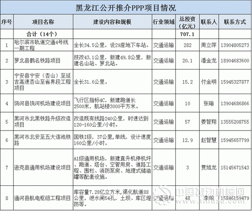 近日,為加快推廣運(yùn)用PPP模式,更好鼓勵(lì)和引導(dǎo)社會(huì)投資,黑龍江省發(fā)改委、財(cái)政廳聯(lián)合推介交通運(yùn)輸、水利、重大市政工程等14個(gè)PPP項(xiàng)目,總投資707.1億元。具體如下: