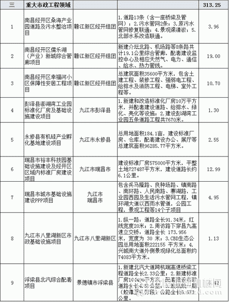 日前,江西發(fā)改委發(fā)布2017年江西省傳統(tǒng)基礎(chǔ)設(shè)施領(lǐng)域第二批政府和社會(huì)資本合作(PPP)推介項(xiàng)目。此次推介PPP項(xiàng)目共43個(gè),這43個(gè)項(xiàng)目總投資453.14億元,其中與基建相關(guān)的項(xiàng)目36個(gè),總投資425.31億元。具體如下: