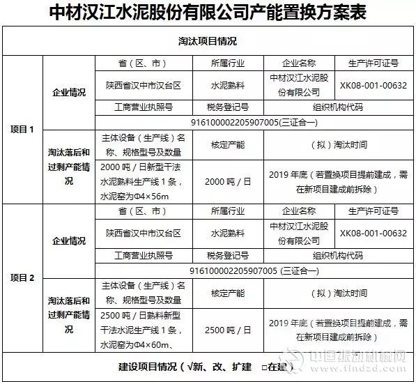 2017年12月29日,陜西省工信廳原材料工業處發布《關于中材漢江水泥股份有限公司建設項目產能置換方案的公示》。公示稱:按照《國務院關于化解產能嚴重過剩矛盾的指導意見》(國發〔2013〕41號)要求,現將中材漢江水泥股份有限公司建設項目產能置換方案予以公示,置換項目列入年度淘汰計劃。